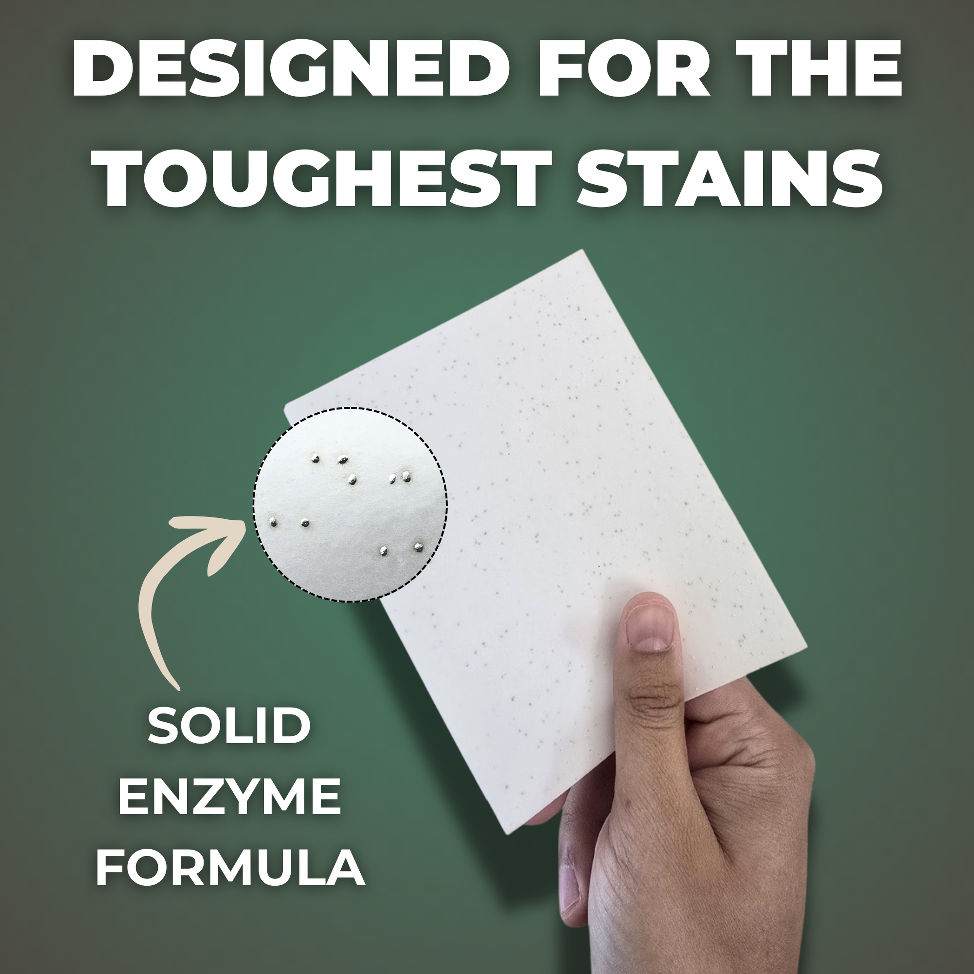 Our formula uses sodium dodecyl sulfate to lift and remove soils, with biodegradable polyvinyl alcohol (PVA) forming a sheet that dissolves easily in water. Kaolin adds structure, while glycerin keeps it stable and sodium citrate softens water for better cleaning.
